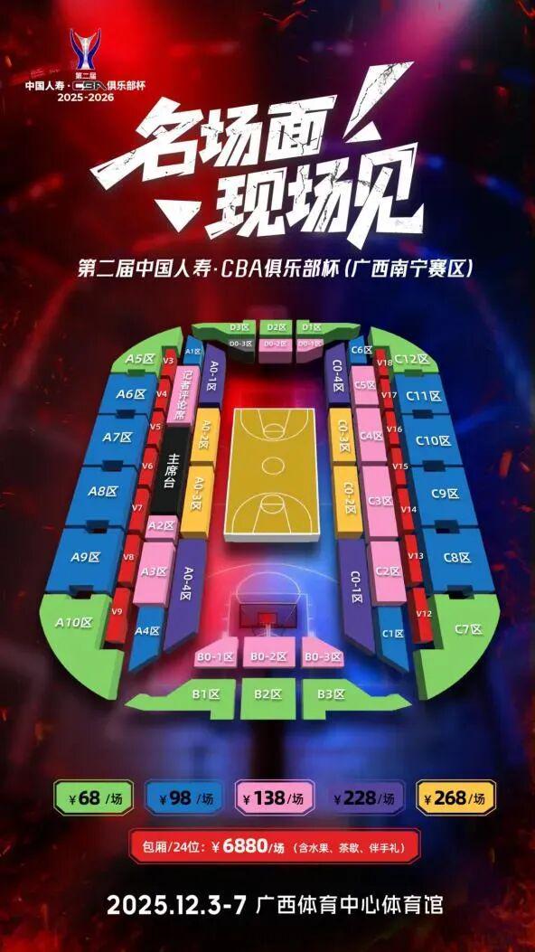 为满足不同观众的观赛需求,赛事设置了68元、98元、138元、228元、268元及6880元(尊享包厢)多个票档,目前门票已通过官方指定渠道全线开售。广大球迷可关注官方发布的赛事动态,亲临现场感受篮球运动的魅力。