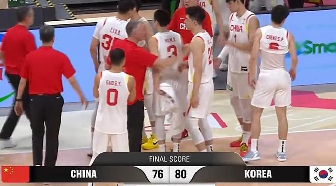 末节韩国队一度将分差拉开到18分,中国队两次暂停布置战术。后半段中国队打出一波10-0的攻击,在1分53秒追到68-77打停韩国队。张镇麟连续三分命中,中国队在1分12秒追到74-79只差5分。最后21秒张镇麟抢断反击造犯规,两罚两中追到76-79。此后中国队再次拿到球权,但张镇麟两次外线不中,中国队最终76-80输掉比赛。