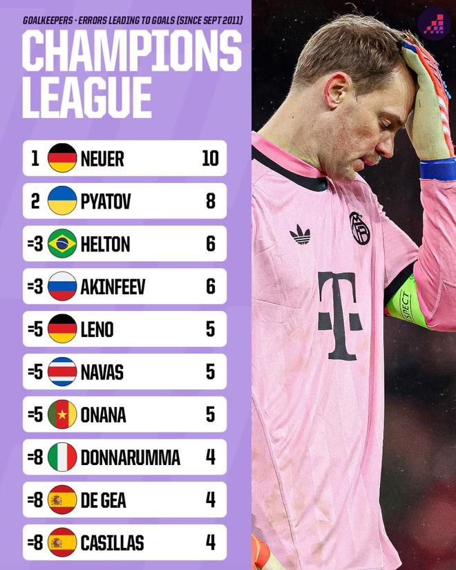 赛后,知名数据机构Opta统计出了自2011年以来欧冠比赛门将失误导致丢球的排行榜,诺伊尔10次排名第一,莱诺、纳瓦斯、奥纳纳、多纳鲁马、德赫亚以及卡西利亚斯上榜。